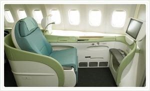 The flag carrier for South Korea, Korean Air has an ambitious first-class service, aptly named “Kosmo Suites,” for VIP passengers. The clever wood finish design of each of these suites (12 are available on the A380 superjumbo and 8 on the 777’s) complements the signature sky blue colored seats beautifully and creates an ambience of tranquility and calm. The seats, stretching at the touch of a button to one of the largest on any commercial airline—to a whopping 79-in long, 26.5 in wide flatbeds, with 83 inches of seat pitch—guarantees ultimate comfort in the skies. You’ll get your own clothing and slippers during the flight, too. You’ll feel as though you’re in an individual movie theatre, cocooned as you are in a fully-enclosed private space, where no one can see you, really, not even what you’re watching on the 23-inch wide-screen LCD monitor at the foot of your bed. If you have work to get done—as the frequent business travelers on Korean Air usually do—the Kosmo Suite’s Sky Office—an individual table, reading lamp, and an in-flight seat power supply—gives you ample office space to be productive. All in all, the smooth design of these suites redefines “cool” in flight. First class seats are also available, apart from those in the Kosmo suites, as are Prestige Class seats, in lieu of Business Class ones. As with Air New Zealand, these seats convert to a fully flat bed, offering passengers the first-class level of comfort in a business class environment.