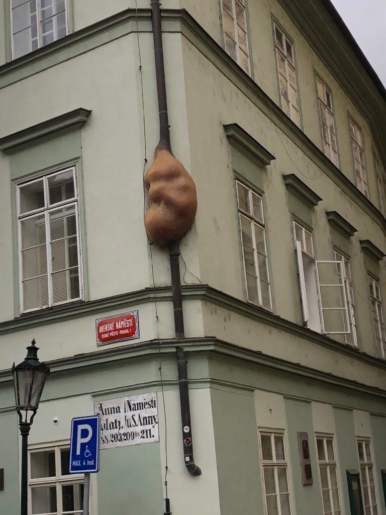 One of Černý’s lesser-known public art works in Prague is entitled “Embryo”. The pink blob hangs on a drainpipe on the façade of the Divadlo Na Zábradlí theater. Installed on December 9, 2008, the piece was placed there to mark the 50th anniversary of the theater. At night, via an internal light, it glows.