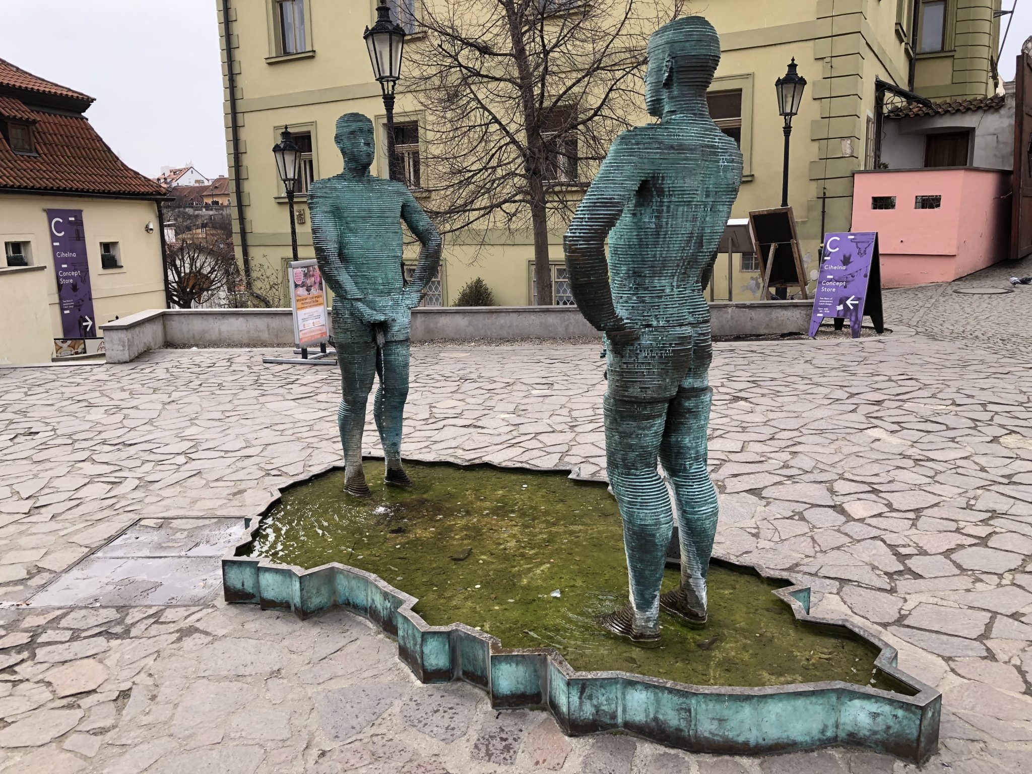 David Černý is one of the most influential sculptors in the Czech Republic, known for his creative and often controversial large-scale installations. The artist has located a number of his works around Prague, which is his hometown, and I had the opportunity to view five of them. One of his latest works is Metalmorphosis,a kinetic sculpture of author Franz Kafka’s head, made of several continuously rotating metallic layers. Another is called Piss, a 2004 sculpture outside of the Franz Kafka Museum in Malá Strana, which features two mechanical men moving realistically while urinating on a map of the Czech Republic.