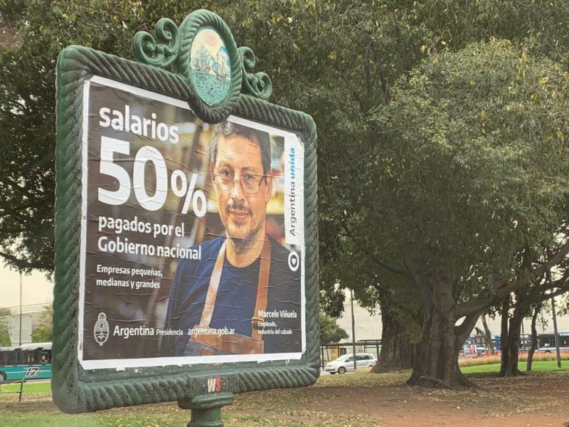 This sign reads “50% of salaries paid for by the national government. Small, medium and big businesses.”