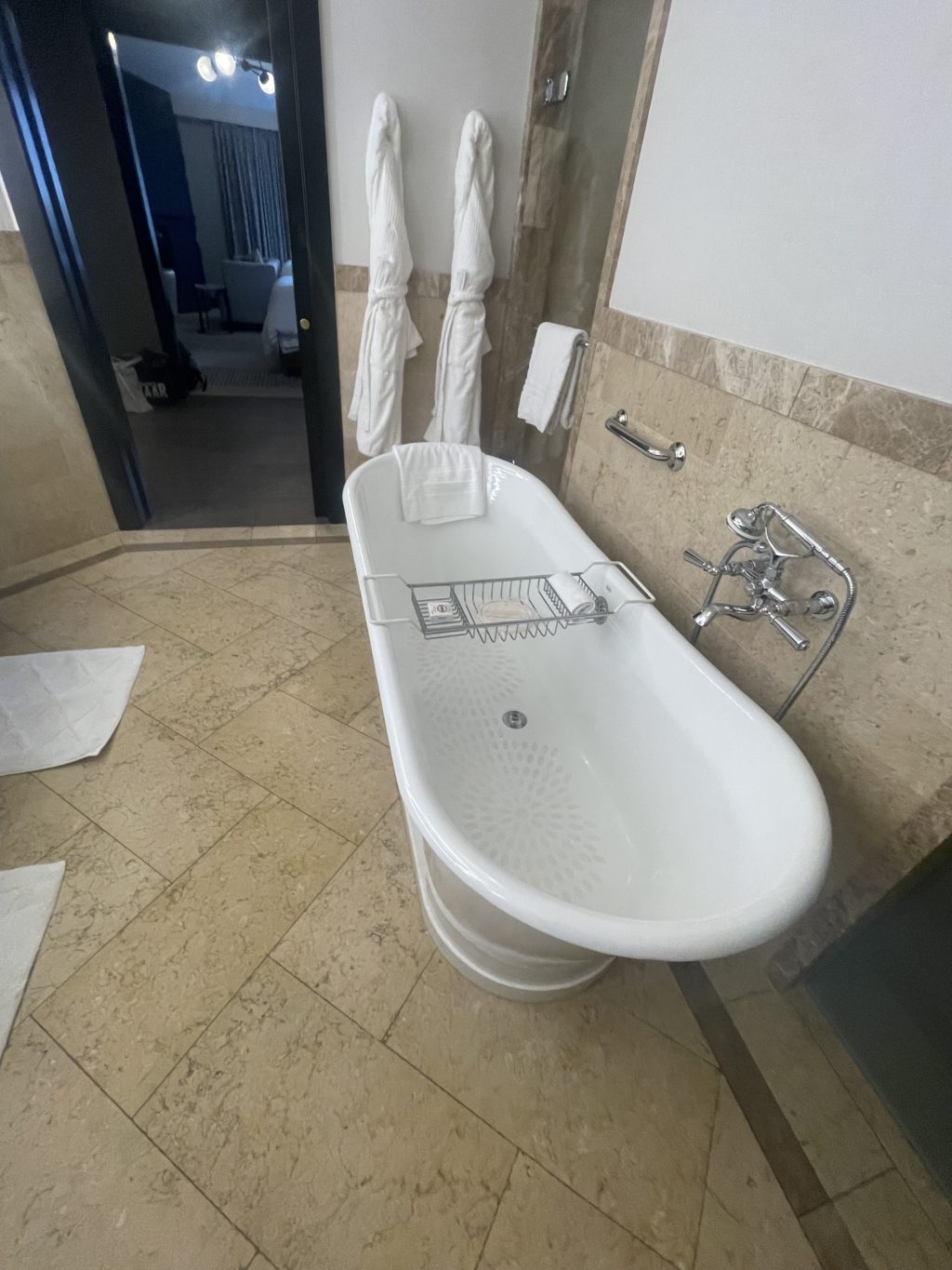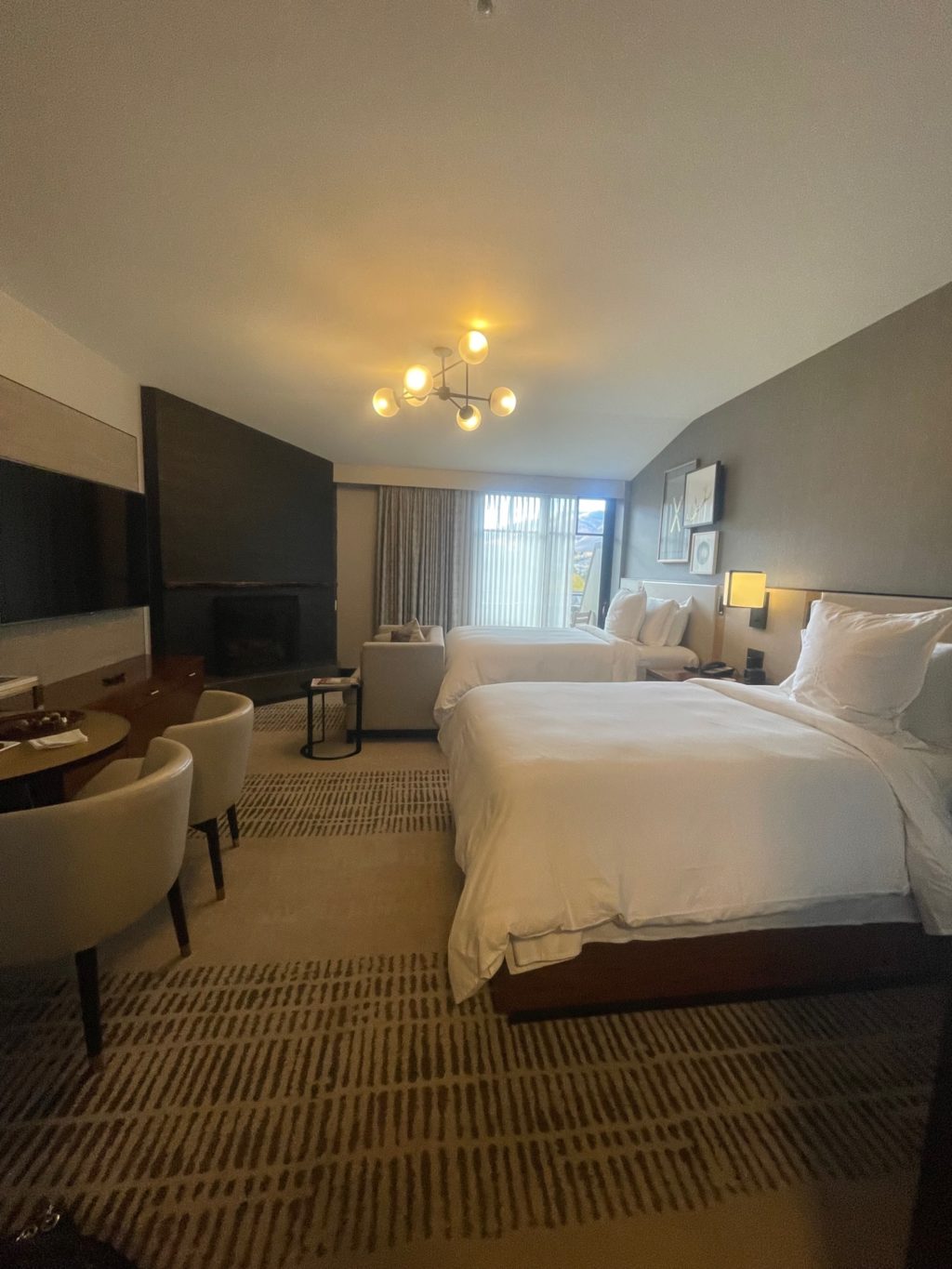 My room was the mountain premiere room, which included two beds, a fireplace, a smart TV, an espresso machine by Nespresso, and a bathtub outside the shower.